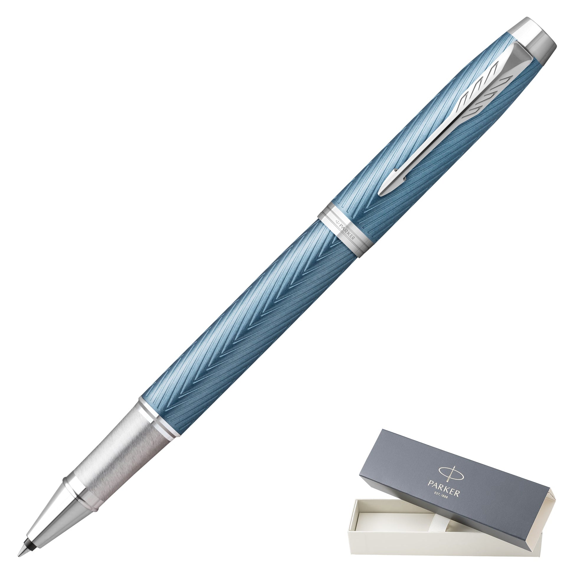 The Parker IM Premium Rollerball Pen in Blue Grey with Chrome Trim seamlessly blends contemporary design with Parker's renowned craftsmanship. Its blue-grey metallic lacquered barrel is intricately engraved with a classic chevron pattern, complemented by polished chrome trims and the signature Parker arrow clip, creating a sophisticated aesthetic suitable for both professional and personal use. The fine-point rollerball tip delivers an effortlessly smooth, consistent flow of black ink onto paper, ensuring a superior writing experience. This pen is compatible with Parker's Quink rollerball refills, allowing for easy maintenance and longevity. Presented in a Parker gift box, it serves as an excellent choice for everyday writing tasks or as a thoughtful gift.