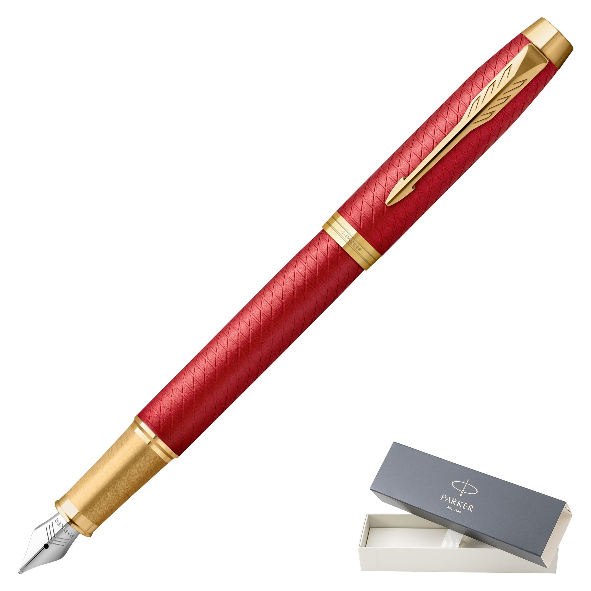 The Parker IM Premium Red Gold Trim Fountain Pen seamlessly blends contemporary design with Parker's renowned craftsmanship. Its matte red lacquered barrel is intricately engraved with a modern line pattern, complemented by polished gold trims and the signature Parker arrow clip, creating a sophisticated aesthetic suitable for both professional and personal use. The fine-point stainless steel nib delivers a smooth and reliable writing experience, ensuring precision with every stroke. This pen is compatible with Parker's Quink ink cartridges and can be adapted for use with bottled ink by inserting a Parker converter (sold separately), allowing for easy maintenance and longevity. Presented in a Parker gift box, it serves as an excellent choice for everyday writing tasks or as a thoughtful gift.