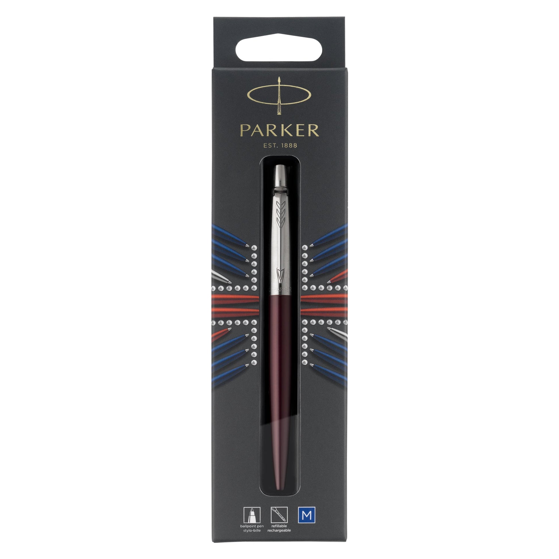 The Parker Jotter Ballpoint Pen in Victoria Violet with Chrome Trim combines classic design with a vibrant hue, offering both style and functionality. Its stainless steel barrel features a rich violet finish, complemented by high-shine chrome trims and the iconic arrowhead clip, creating a sophisticated aesthetic suitable for various settings. The retractable design operates with a satisfying click, and the medium point delivers smooth, consistent blue ink flow, ensuring an optimal writing experience. This pen is compatible with Parker's Quinkflow ballpoint refills, allowing for easy maintenance and longevity. Presented in standard packaging, it serves as an excellent choice for everyday writing tasks or as a thoughtful gift.