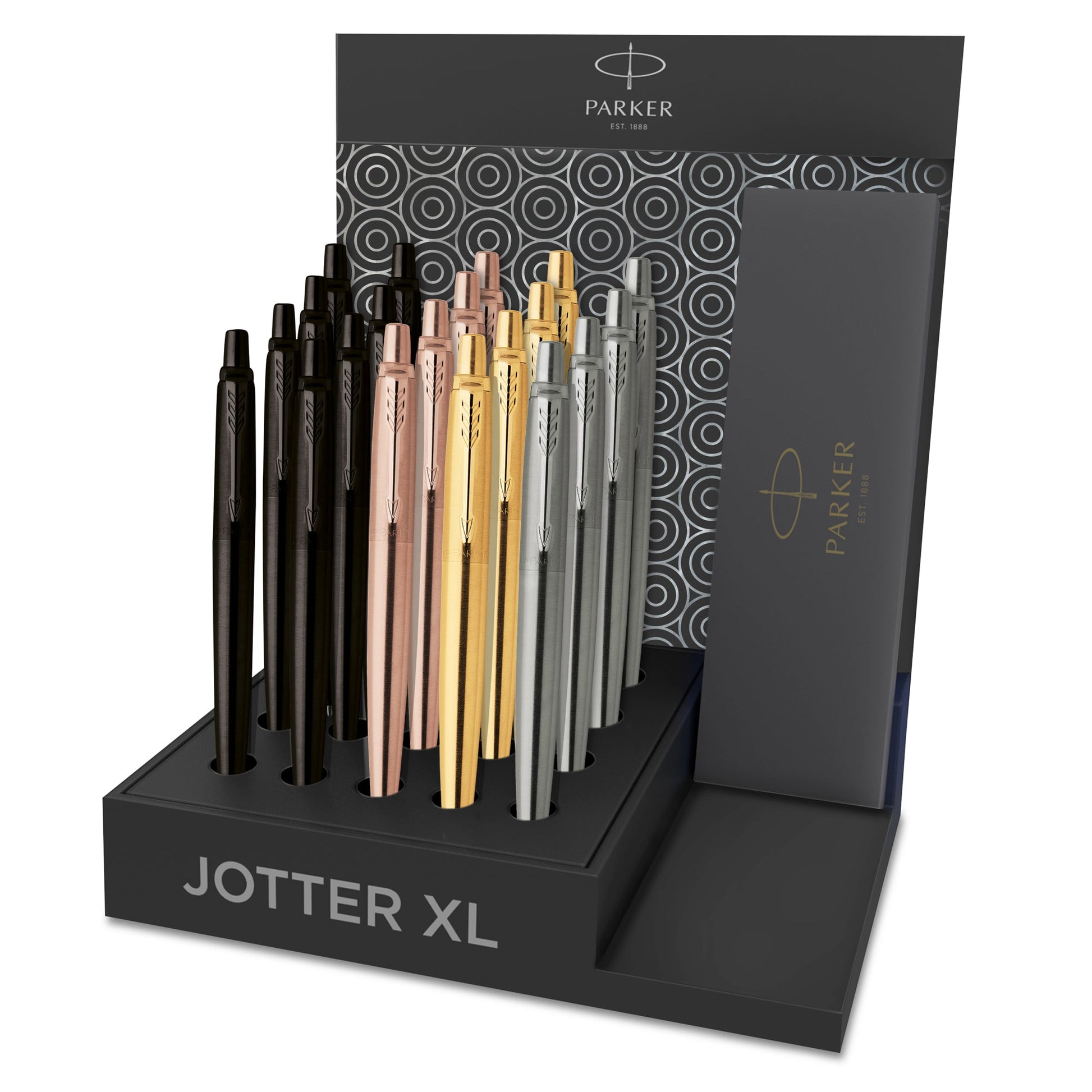- Comprehensive display unit featuring 20 Jotter XL Monochrome ballpoint pens in four distinct finishes