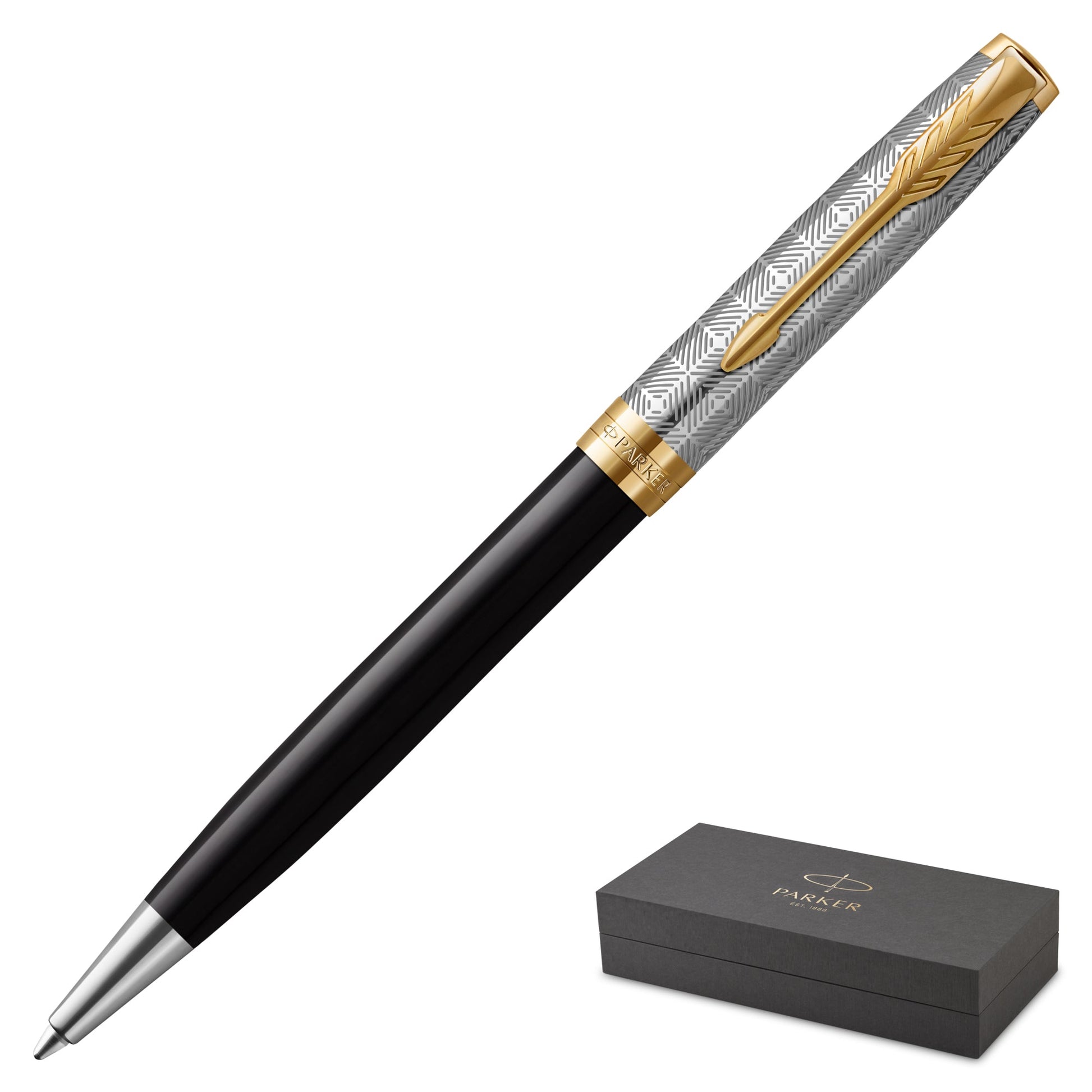 The Parker Sonnet Metal & Black Gold Trim Ballpoint Pen is a symbol of timeless elegance and superior craftsmanship. Featuring a sophisticated combination of metal and black lacquer, accented by luxurious gold trim, this pen is designed for those who appreciate refined style in their writing instruments. The medium-point tip delivers smooth, consistent black ink, making it ideal for all your writing needs, from signing important documents to everyday note-taking. The Parker Sonnet is renowned for its balance and comfort, providing an exceptional writing experience with every use. Presented in an elegant gift box, this pen is perfect for personal use or as a thoughtful gift for any occasion.