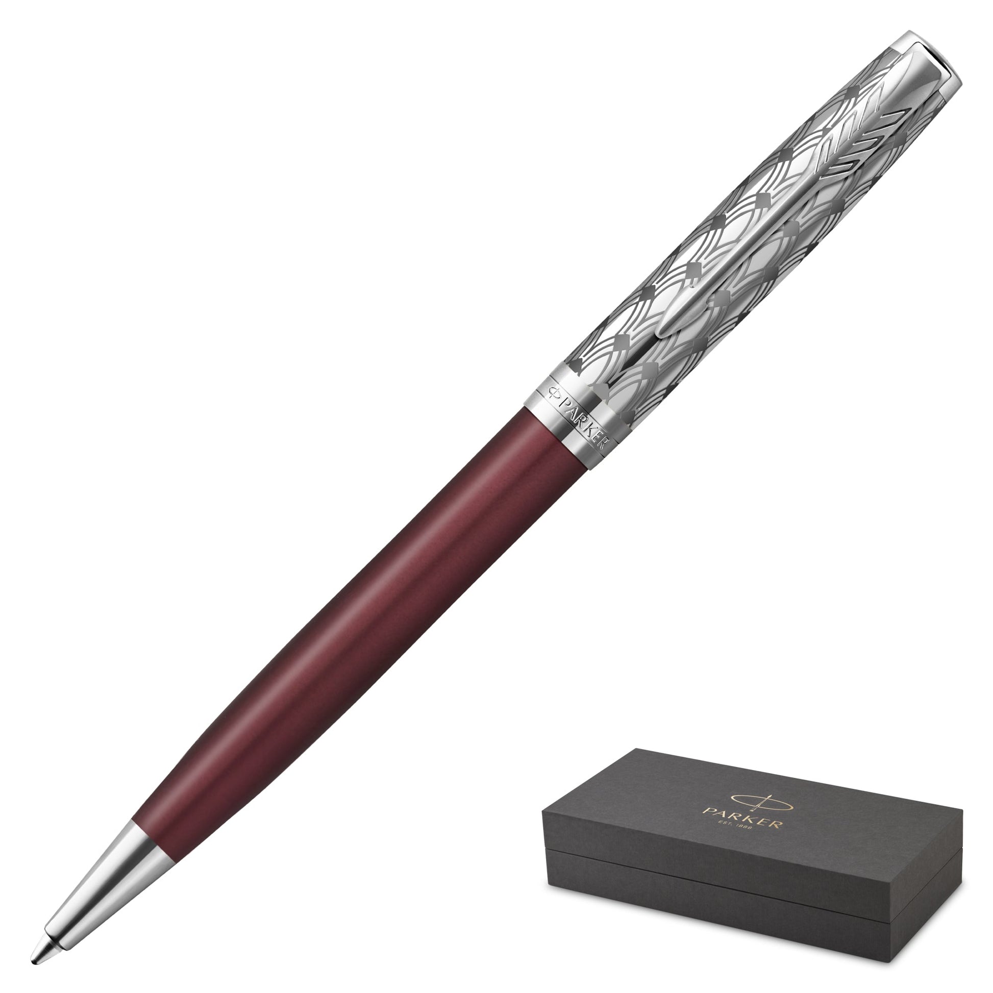 The Parker Sonnet Metal Red Chrome Trim Ballpoint Pen is a stylish and sophisticated writing instrument, designed for those who appreciate both elegance and performance. Featuring a vibrant red metal finish, beautifully complemented by polished chrome trim, this pen adds a touch of modern flair to any professional or personal setting. The medium-point tip ensures smooth, consistent black ink flow, making it ideal for daily writing tasks, from signing documents to jotting down notes. Renowned for its balance and comfort, the Parker Sonnet offers a refined writing experience that combines reliability with a sleek aesthetic. Presented in an elegant gift box, this pen is perfect for gifting to colleagues, clients, or loved ones who value high-quality writing instruments.