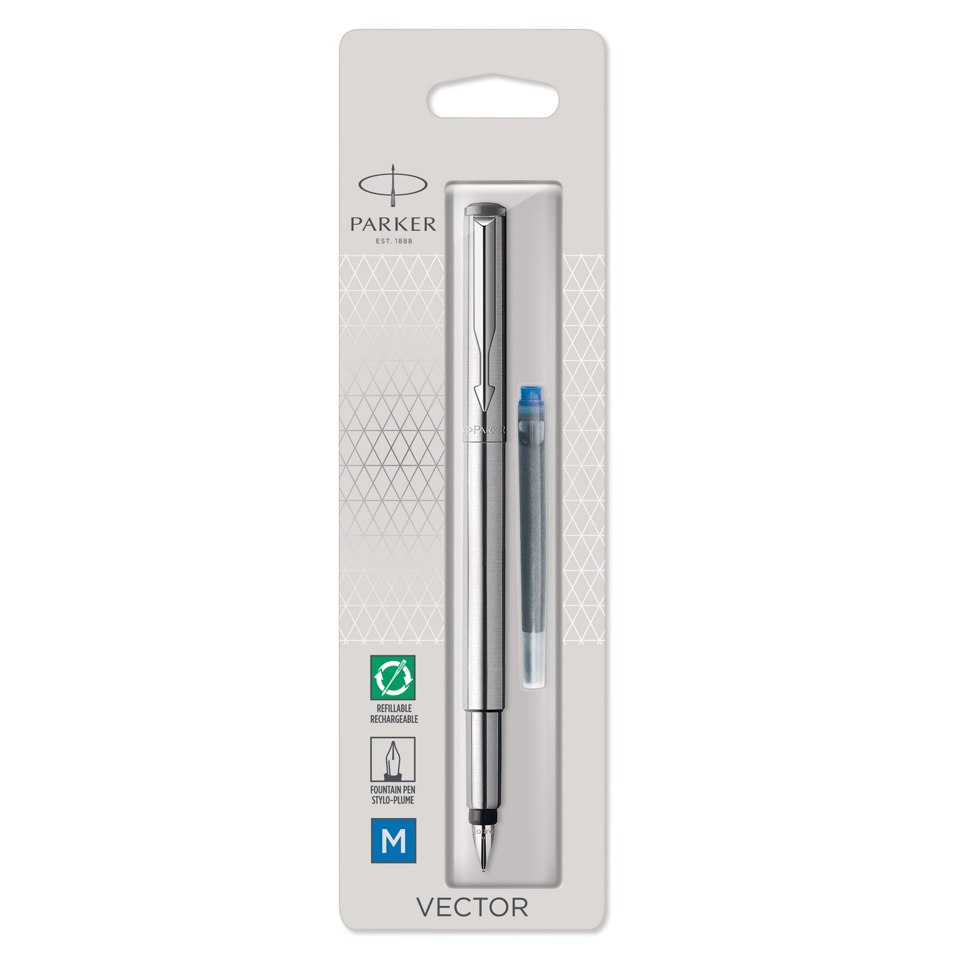 The Parker Vector Stainless Steel Fountain Pen exemplifies Parker's commitment to quality and reliability, making it a dependable choice for everyday writing needs. Its brushed stainless steel finish and chrome-plated trims offer a classic and timeless appeal. The durable stainless steel nib provides a consistent and smooth writing experience, suitable for both left- and right-handed users. This pen includes one blue ink cartridge and is compatible with Parker's proprietary ink cartridges.