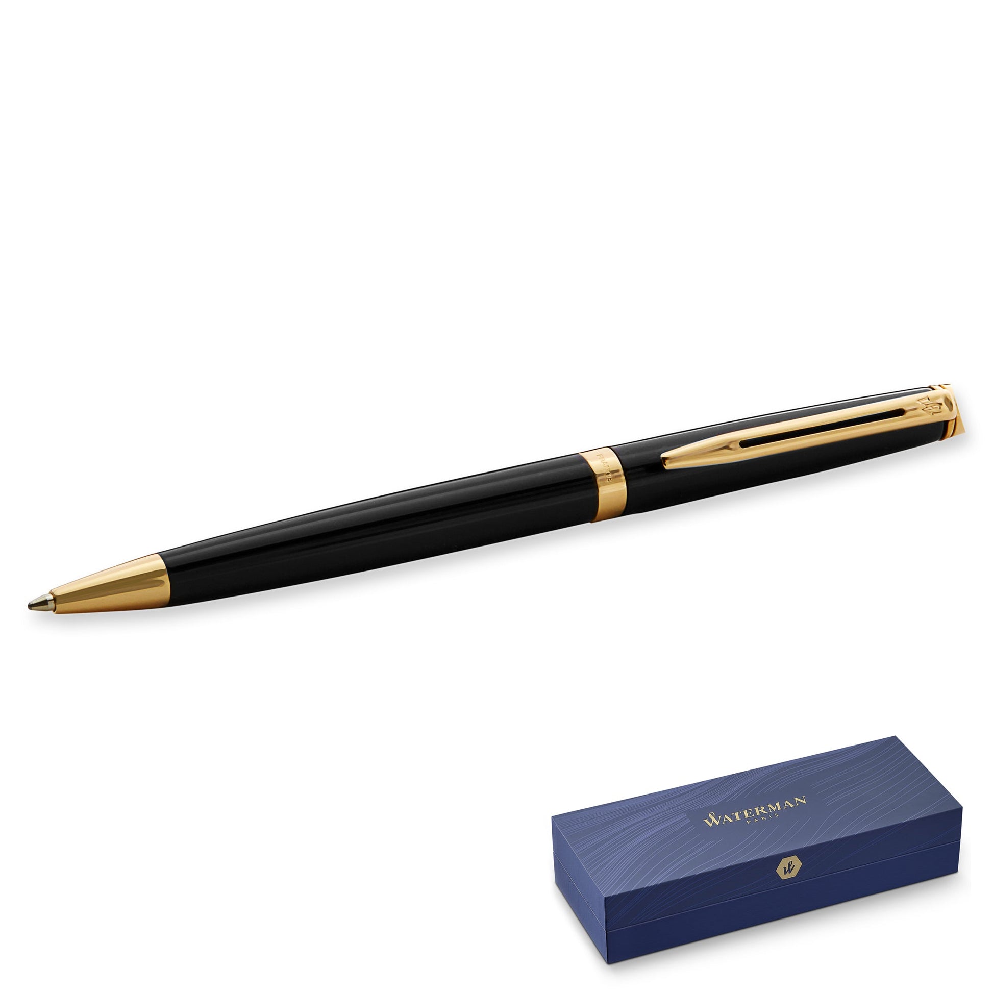 The Waterman Hémisphère Black Gold Trim Ballpoint Pen is the perfect blend of modern elegance and reliable performance. Featuring a sleek black lacquer finish, this pen is beautifully accented with luxurious gold trim, creating a sophisticated look that suits any professional environment. The medium-point tip ensures smooth, consistent blue ink flow, making it ideal for everyday writing tasks, whether in the office or on the go. Known for its slim and lightweight design, the Hémisphère offers a comfortable writing experience, combining style with functionality. Presented in an elegant gift box, this pen makes a thoughtful gift for professionals, students, or anyone who appreciates high-quality writing instruments.